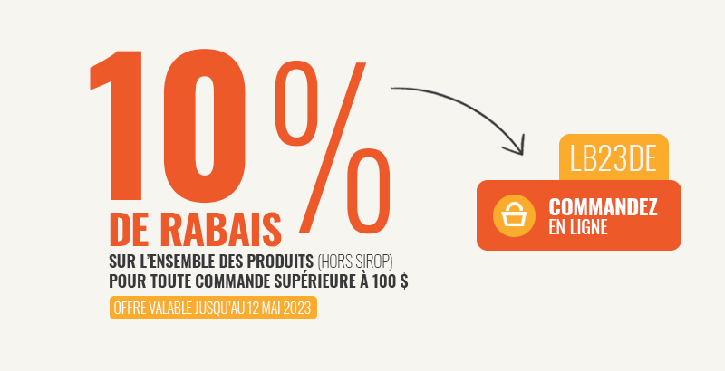 Pour célébrer le lancement de cette saison 2023, nous sommes ravis de vous annoncer que nous offrons un rabais de 10% sur l’ensemble de nos produits – hors sirop – pour toute commande supérieure à 100 $ (hors frais de livraison).